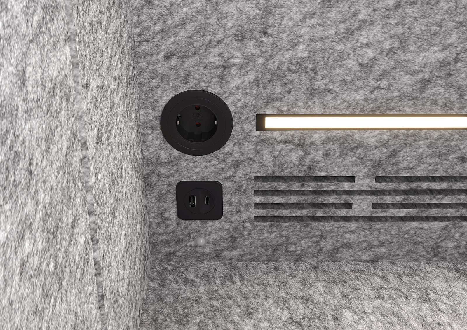 - Anschlüsse für Strom und USB (jeweils 1x USB Typ A und 1x USB Typ C) in der Decke integriert